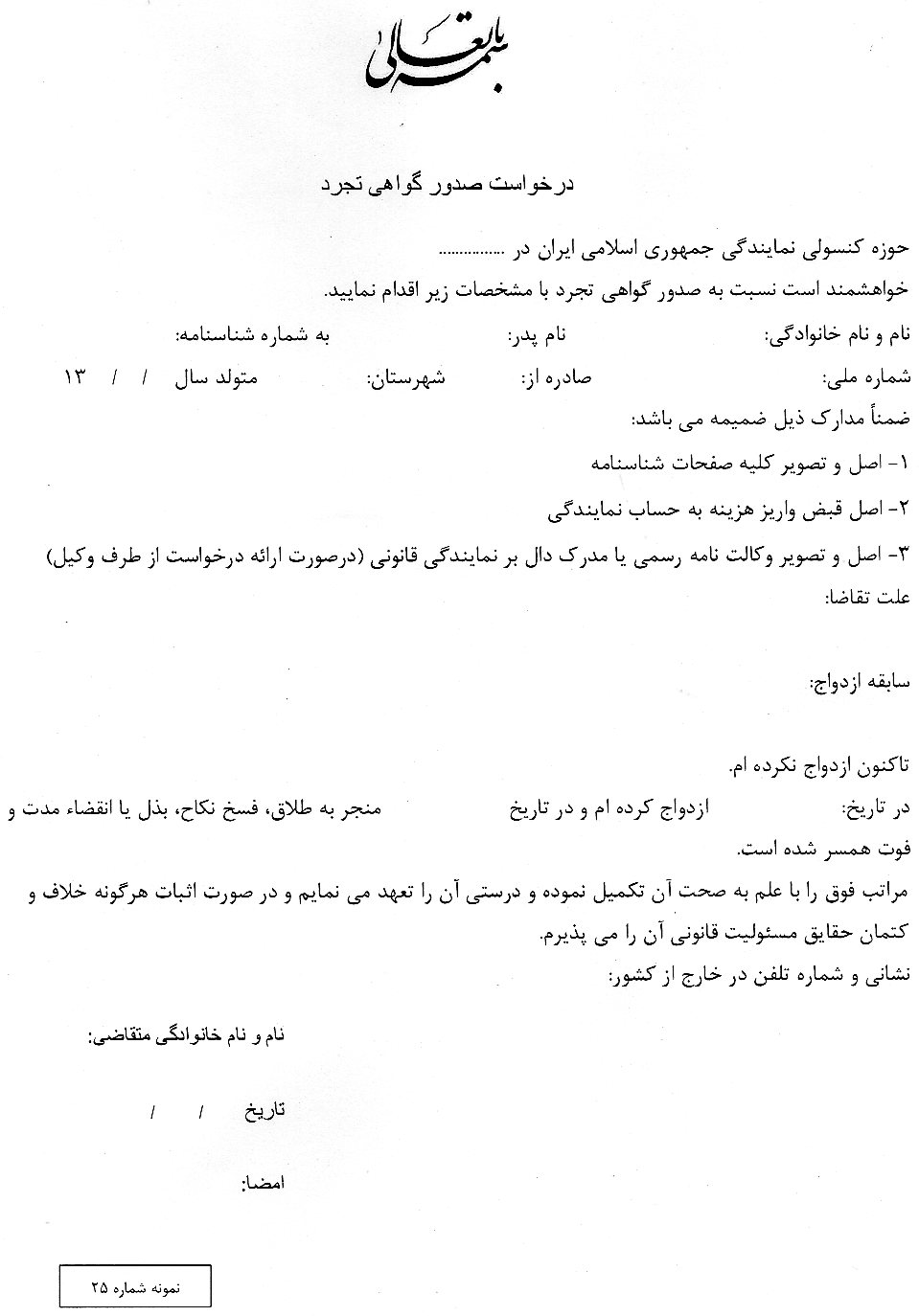 1- تکمیل فرم درخواست صدور گواهی تجرد و اجازه ازدواج
