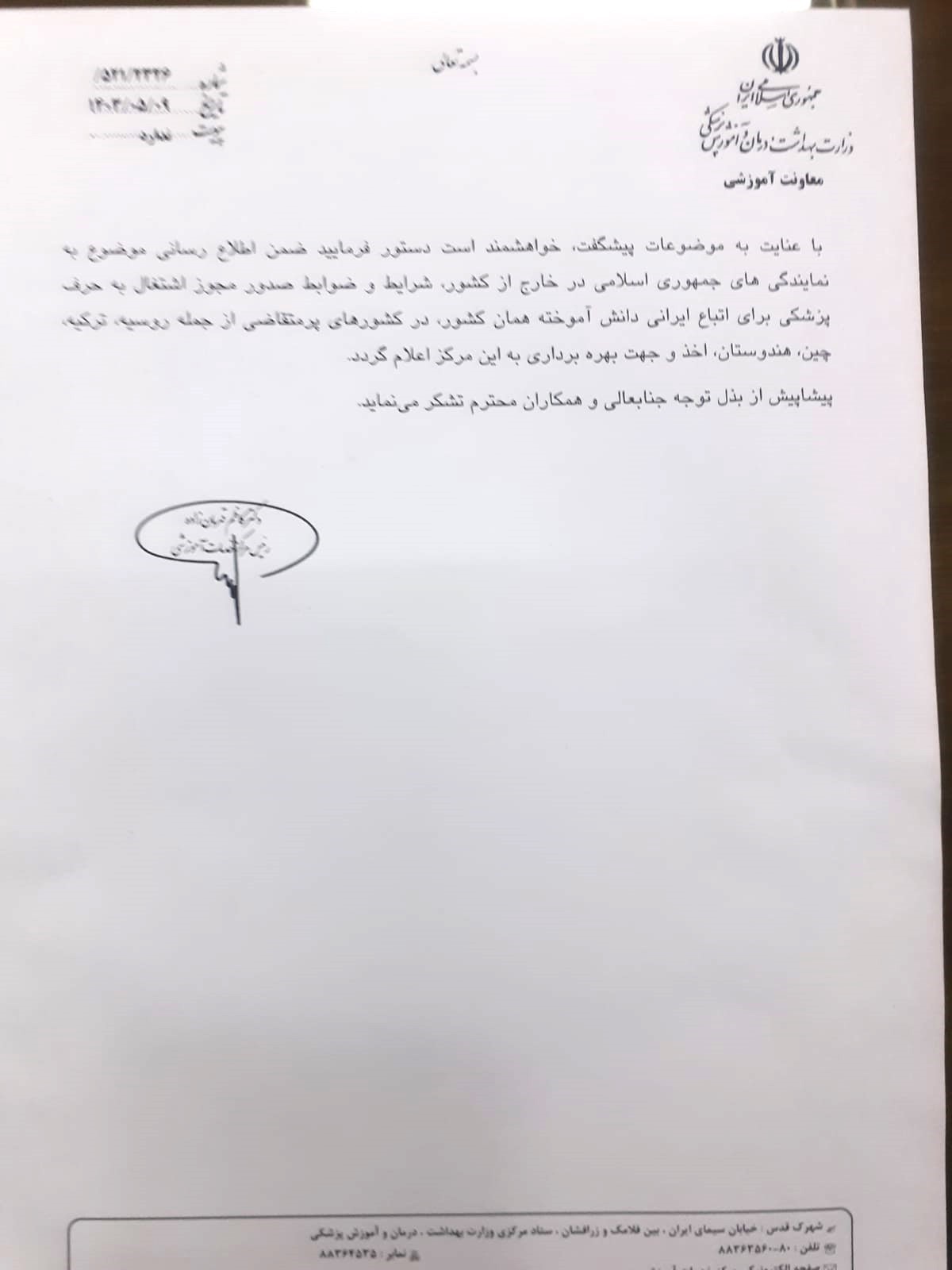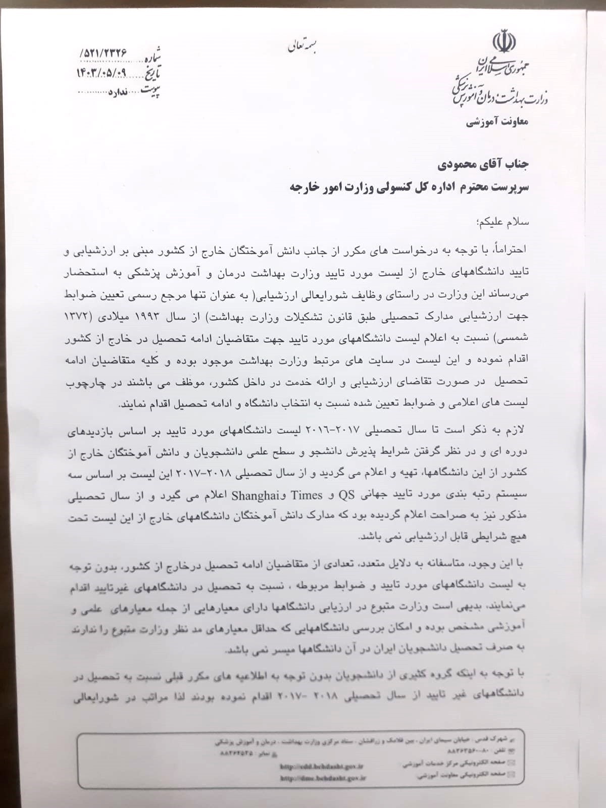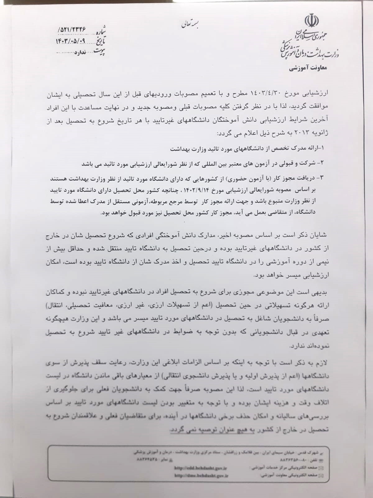 اطلاعیه در خصوص ارزشیابی مدارک تحصیلی دانشجویان شاغل به تحصیل در خارج ازکشور