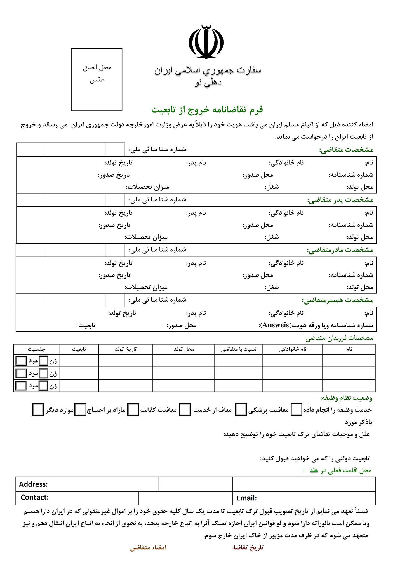 تکمیل فرم درخواست خروج از تابعیت توسط متقاضی در سه نسخه، ( کلیه فرم های لازم برای متقاضی)